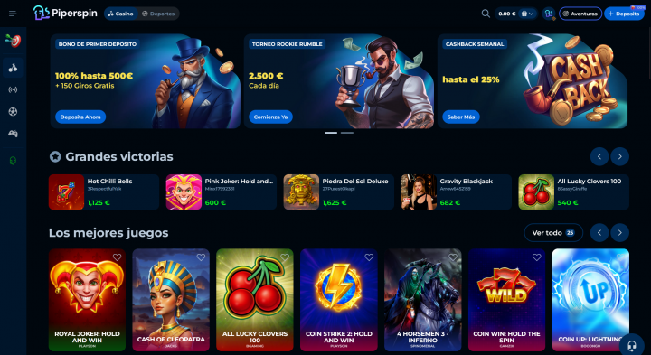 Piperspin tiene una interfaz que luce simple a la vista, pero que a su vez esconde muchas sub-secciones y sub-páginas para navegar entre todo su contenido. En su catálogo, esconde más de 3 mil juegos y más de 40 deportes, ambos disponibles en una gran variedad de opciones para ajustarse a cualquier jugador. En cuanto a los beneficios, los bonos no están nada mal, son variados y la mayoría facilitan al jugador la liberación, pues usan rollovers alcanzables.