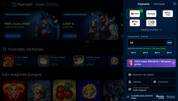 Los depósitos y retiros en Piperspin se ofrecen en tarjetas, transferencias y criptomonedas. Nosotros probamos pagos utilizando Visa, transferencias a Banco Santander y USDT a través de la red de TRON. Nuestra prueba de calidad nos demostró que se puede depositar y retirar sin problemas, por lo que el sitio es seguro, aunque es un casino bastante pequeño y los límites de depósito y retiro son bastante bajos.