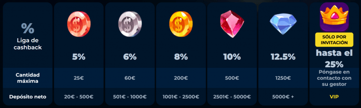 Piperspin ofrece un excelente programa de reembolso que depende del monto que deposites durante la semana. Puedes obtener del 5% al 25%, con reembolsos que empiezan en 25€ semanales hasta cantidades personalizadas.