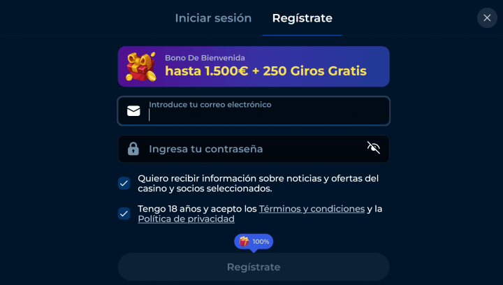 Puedes registrarte hoy mismo y optar por el paquete de bienvenida de Piperspin del 55%-100% hasta 1.500€ + 250 FS. Solo debes utilizar el enlace de este artículo para acceder directamente a la pantalla de registro con el bono ya activado. Luego, solo sigue este paso a paso para completar el registro: