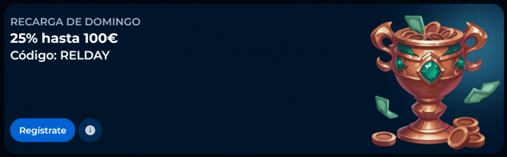Si usas el código RELDAY los domingos vas a recibir un bono del 25% hasta un máximo de 100€. Este bono tiene las mismas condiciones que el bono de bienvenida.