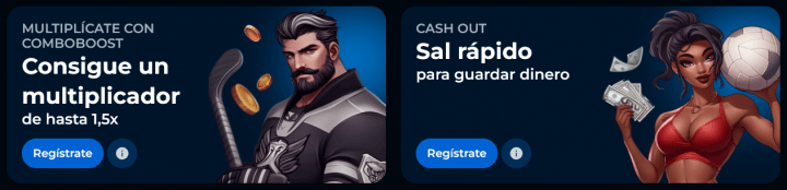 Junto con todas las ofertas deportivas, también puedes aprovechar funciones especiales como el cashout y mejoras premio en combinadas.