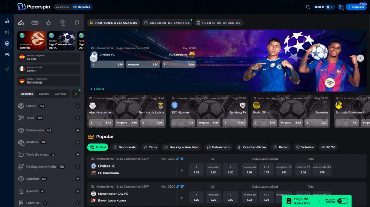 Piperspin te permite apostar en 43 deportes diferentes tanto pre-partido como en directo. La cobertura de deportes es proporcional a la cantidad de mercados y ligas que ofrecen, así que puedes apostar tanto al ganador en ligas principales como la UCL o La Liga, al mismo tiempo que apostar a mercados especiales de ligas de nicho. Además, sus cuotas son también competitivas, con márgenes de la casa que oscilan entre 4%-6% en el fútbol y otros deportes populares. En general, es un sitio bastante versátil para apostar, con cuotas realmente competitivas dentro del mercado español y latinoamericano.