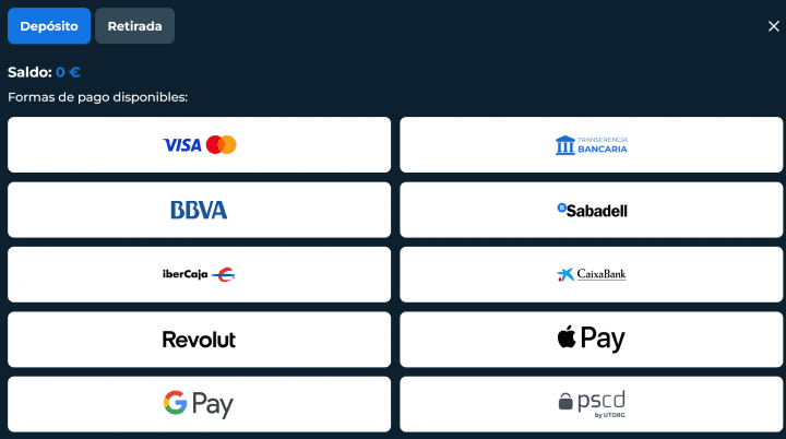 - Transferencias: IberCaja, BBVA, Sabadell, transferencia bancaria estándar, Revolut, CaixaBank, Instant Bank y Rapid Transfer.