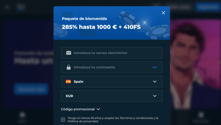 Para obtener ahora mismo el paquete de bienvenida del 285% (acumulado) hasta un máximo de 1.000€ + 410 TG. Para hacerlo, clica en este artículo en el botón de “Juega Ya” para ser redirigido al casino y empezar el registro. Ahí, solo completa el formulario: ingresa tu correo electrónico, crea una contraseña, elige tu país de residencia, elige una divisa y, por último, acepta los T&C antes de clicar en el botón de “Registrarse”.