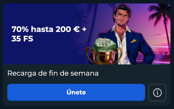 Los sábados y domingos se da un bono del 70% hasta 200€ + 35 tiradas gratis. Tienes que cumplir el mismo rollover, vigencia y límites de ganancias del bono de bienvenida.