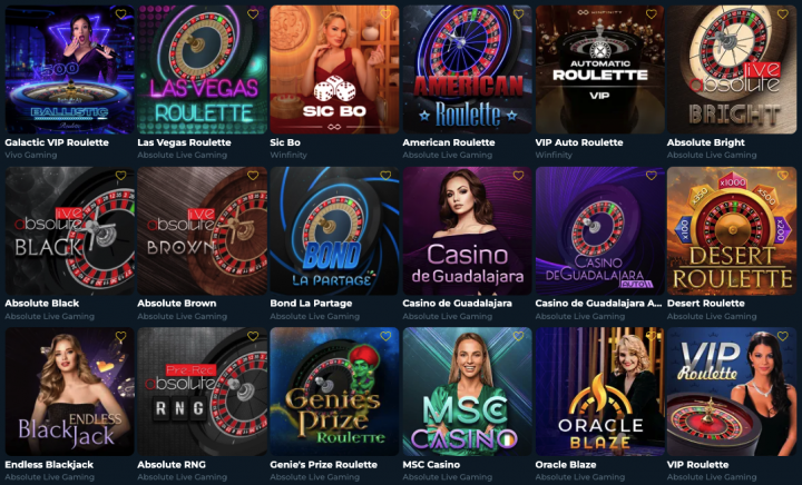Para partidas de juegos de mesa, hay juegos con RNG digitalizados de blackjack, ruleta, póker de vídeo, bacará, dados, solitario y más. Sin embargo, tienes que buscar los juegos por su nombre, ya que no tienen una sección exclusiva.