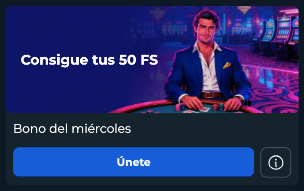Los miércoles se otorga un bono de recarga de 50 tiradas gratis. Solo tienes que depositar 20€ o más. Luego, hay que cumplir un rollover de 35x veces las ganancias obtenidas en 5 días. Puedes ganar hasta 100€ con este bono.