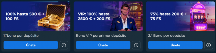 | Bono de bienvenida | 50-100% hasta 1.000€ + 410 FS | 25%-125% hasta 3.550€ + 650 FS | 25%-100% hasta 2.400€ + 150 FS |