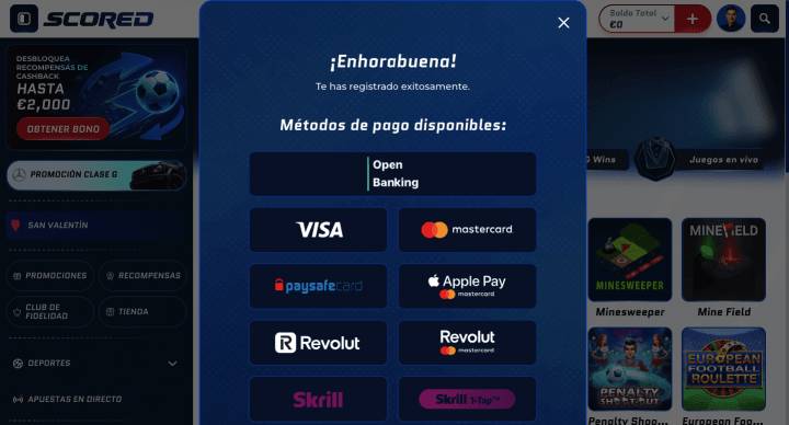 Los métodos de pago de Scored son algo positivos: tienen de todo y funcionan muy bien. Encontramos pagos con tarjetas, transferencias, vouchers, carteras electrónicas, cripto, pagos móviles y más. No pudimos probarlos todos, pero sí una gran parte de ellos, y ninguno nos dio problema alguno.