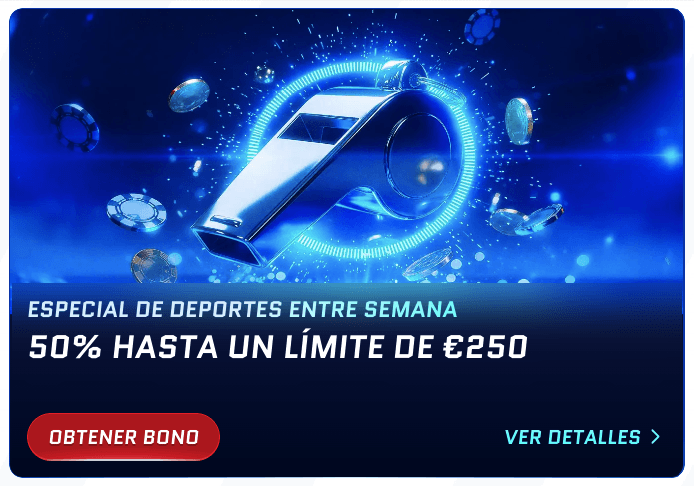 - Bono del 50% hasta 250€ entre lunes y viernes.