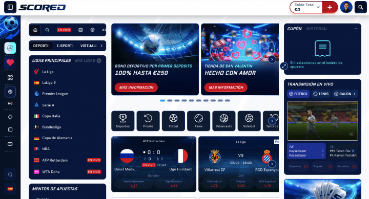 Aunque el casino sea muy destacado, las apuestas deportivas son la especialidad de Scored. Hay 39 deportes distintos para elegir lo que más te guste, desde fútbol hasta deportes de inteligencia artificial (virtuales). Puedes apostar en vivo o pre-partido, con un promedio de más de 100 mercados por evento deportivo.