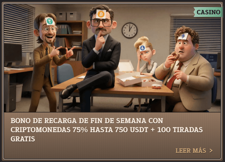 Para las criptomoneas también hay un bono de fin de semana que da el 75% hasta 750 USDT + 100 tiradas gratis. Se activa con un depósito de al menos 75 USDT y se libera cumpliendo un rollover de x30 que no está mal, pero se puede mejorar.