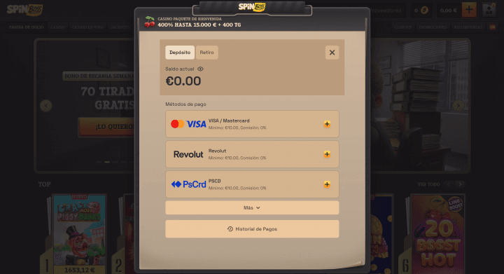 Métodos de pago disponibles en SpinBoss