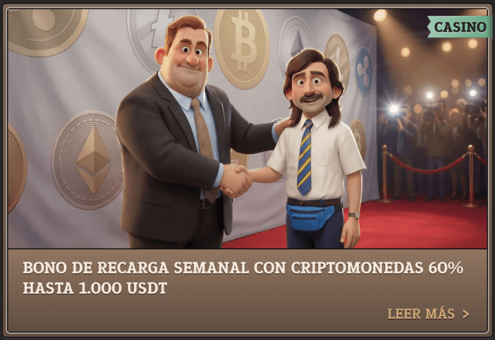Depositando al menos 50 USDT a la semana (lunes a jueves), te dan 60% de tu depósito hasta 1.000 USDT. Esta vez, el requisito de apuesta es de x30. El bono es medianamente competitivo, aunque debemos admitir que no es la mejor promo con cripto que hemos encontrado.