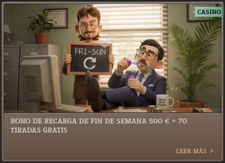 Para los fines de semana (viernes a domingo) encontramos una promo del 50% hasta 500€ + 70 tiradas gratis. Este se activa con 20€ y exige un rollover que es bastante malo: 35x veces el bono sumado al depósito y 40x veces las ganancias de las tiradas gratis. Lo recomendamos principalmente para jugar gratis.