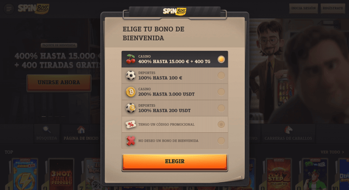 SpinBoss es una plataforma lanzada por el Casolinia Group en 2026 con muchas ofertas adecuadas para jugadores high rollers. Su paquete de bienvenida robusto es masivo, llegando a ofrecerte hasta 15 mil euros adicionales, para luego completarse con ofertas igual de robustas tanto en criptomonedas como en euros.