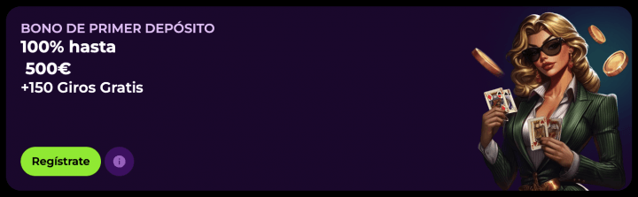- 100% de tu primer depósito hasta 500€ + 150 tiradas gratis.
