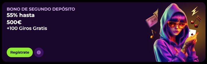 - 55% de tu segundo depósito hasta 500€ + 100 tiradas gratis.