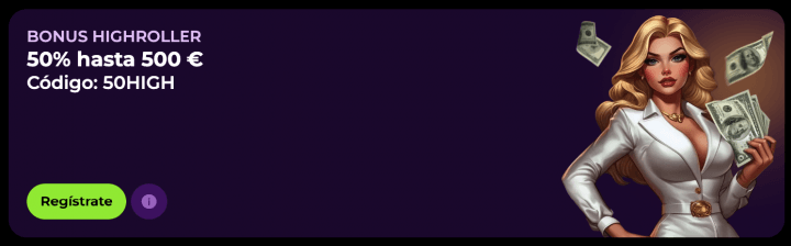 - Bono para high rollers: Usando el código 50HIGH puedes usar un bono del 50%hasta 500€. Tienes que depositar al menos 300€ y cumplir un rollover de 35x del valor total del bono.