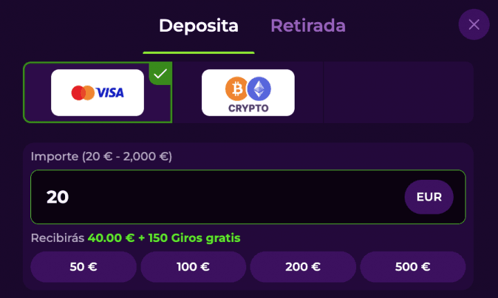 - Al abrirse el cajero, solo queda elegir un método de pago, ingresar al menos 20€ y tu bono se reflejará inmediatamente en el saldo de tu cuenta.