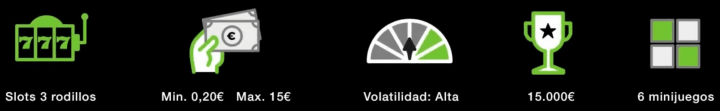 Además de ello, cuenta con una volatilidad muy alta, debido a que todos los premios ofrecen ganancias mayores al valor de cada tirada. Esto quiere decir que su frecuencia de pago es baja.