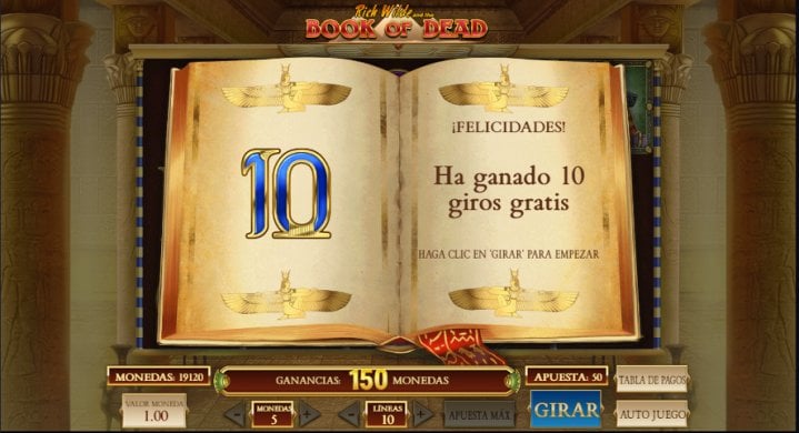 Además, si aparecen tres o más símbolos de libro de los muertos durante la ronda de giros gratis, se te otorgarán 10 giros gratis adicionales.