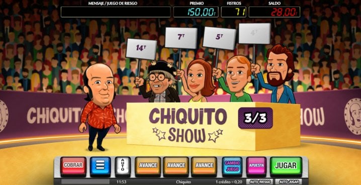 Al completar tres símbolos del Chiquito en el juego superior puedes acceder a este minijuego. En este caso, se sortea completamente al azar una serie de premios obtenidos de 4 jueces en una calificación de los chistes contados por nuestra carismática estrella. Son 3 intentos, por lo que puedes conseguir grandes premios.