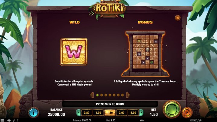 Desde antes de ser lanzada, la tragaperras Rotiki ya era descrita como una tragaperras entretenida y de magníficos colores. Lo que nuestro equipo puede confirmar es que su temática de selva en combinación con tandems isleños, y hasta un poco de cultura azteca hacen una mezcla tan multicultural como interesante.