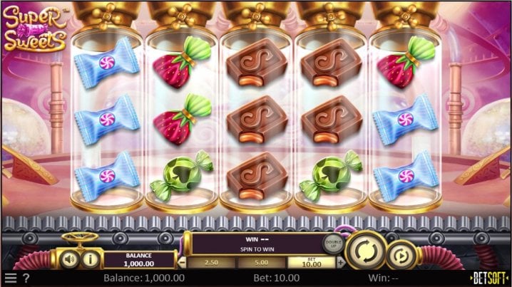 La tragaperras Super Sweets viene con 5 carretes, 3 filas y 10 líneas de pago. No te dejes desanimar por las pocas líneas de pago ya que esta tragaperras produce muy buenas victorias. Tal como sucede con toda las tragaperras, los símbolos deben formar combinaciones de 3, 4 y 5 símbolos en los carretes ‘1-2-3’, ‘1-2-3-4’ o ‘1-2-3-4-5’, así todas las combinaciones se conectan de izquierda a derecha en los carretes adyacentes.