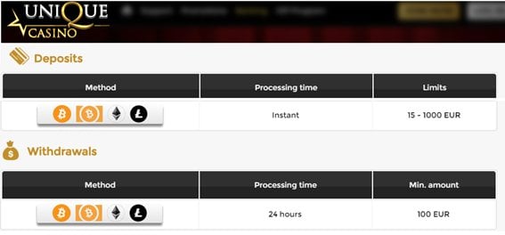 Si bien los depósitos suelen ser inmediatos, es conveniente que consultes en la sección de depósitos de tu casino online. Como ejemplo te proveemos los tiempos de transacción para depósitos y retiros en criptomonedas del casino Unique.