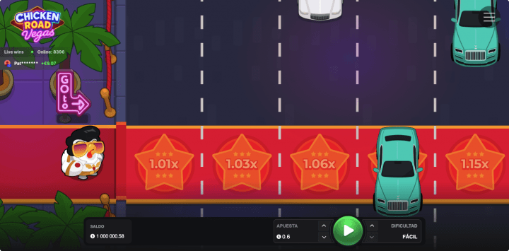 El Chicken Road Vegas combina el argumento del Chicken Road 2 con la ciudad del pecado en Nevada. Aquí la gallina protagonista se disfraza de Elvis y es alumbrada por un reflector de tarima, todo mientras atraviesa una alfombra roja con estrellas (multiplicadores). Este juego también mantiene un RTP de 95,50%, aunque muestra una nueva interfaz que cambia de posiciones los botones de juego.