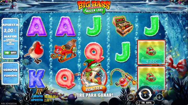 Big Bass Christmas Frozen Lake mantiene lo clásico de la saga, con 5 carretes y 3 filas que despliegan 10 líneas de pago. El juego también ofrece tiradas gratis, símbolos de dinero, y ahora con apuestas Ante y compra de bonos. El juego te permite ganar hasta 5.000x veces tu apuesta gracias a su RTP de 96.07% y su alta volatilidad.
