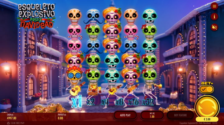 La pantalla de juego de Esqueleto Explosivo Feliz Navidad es una cuadrícula de 5x5 con mecánicas de pago cluster y un sistema de cascada. Pero lo mejor viene en los pagos, todas las combinaciones ganadoras activan multiplicadores (Mucho Multiplier) que aumentan a medida que ganas, además de que se reemplaza uno de los símbolos con un wild. Además, ofrece ronda de bonus, junto con función de compra de bonos y hasta 3 tipos de apuestas Ante. En cuanto al desempeño, arroja un RTP del 94.22%, una alta volatilidad, y la oportunidad de ganar hasta 7.500x el valor de tu apuesta.