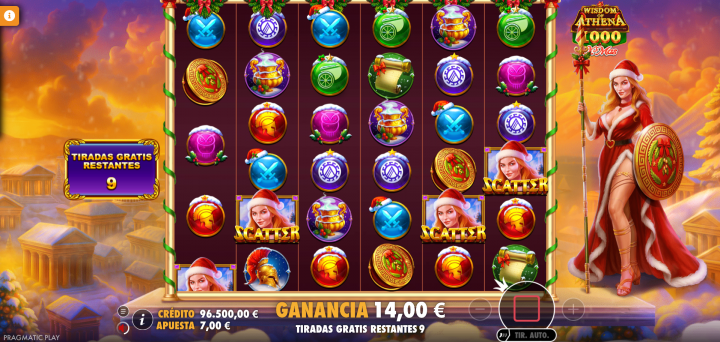 Wisdom of Athena 1,000 Xmas es uno de los mejores lanzamientos navideños que el gigante Pragmatic Play ha traído este 2025. Esta vez, el Monte Olimpo se cubre de nieve y decora sus ancestrales columnas para las fiestas decembrinas, con Atenea disfrazada de Santa y observando la partida en todo momento. Esta slot mantiene como atractivo principal la serie “1000”, lo que te permite obtener un multiplicador de ese tamaño y mejorar por muchos tus premios.
