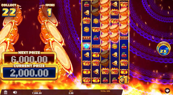 Free Spins Round: Free Spins are represented by a drum with the text ‘Bonus’ on it. These can land on reels 2, 3, and 4. Collecting at least three of these allows bettors to enter the bonus round. During the Free spins bonus round, diamond symbols can be collected to climb levels.