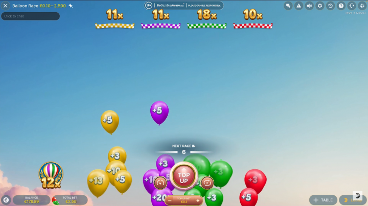 During the top-up round, three to six balloons with multipliers float up towards the top of the screen. Each color can only have a maximum of two balloons. Some of these balloons may burst along the way. All the balloons that actually make it to the top get their multipliers added to their colors.