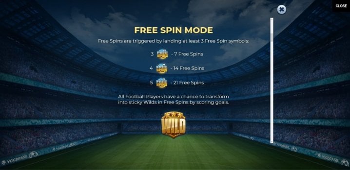 Player’s Glory Free Spins: When you land football star combinations, the meter that corresponds to that player will be credited. When a meter is full, you will be awarded 7 free spins. The player will enter ‘Superstar Mode’ and his symbol will become a sticky wild.