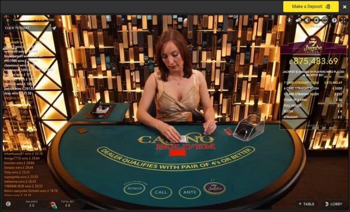 Casino Hold’em was already a popular live dealer game at the online casinos but with Jumbo 7, players are going to flock to the tables. A top jackpot of 1 million is up for grabs which is certainly not to be sniffed at. Offering the high standard of production quality that Evolution Gaming is renowned for, this has to be up there as one of the best Casino Hold’em live dealer games around.