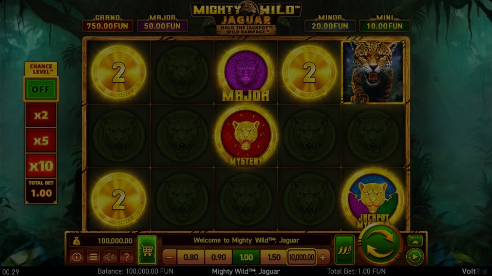 The second bonus game is called Wild Rampage, the bonus symbols for which include Jaguar, Jaguar Mystery, Jaguar Mystery Jackpot, and Jaguar Mystery Multiplier. The slot can be played at three volatility levels: low, standard, and high. There is also a buy feature, which allows you to activate two additional levels of volatility: extreme or double extreme.