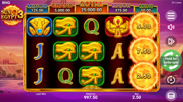 - Hold and Win Bonus: Landing more than six sun symbols gave us the Hold and Win bonus round, during which the sun symbols became sticky, and we were awarded three free spins.