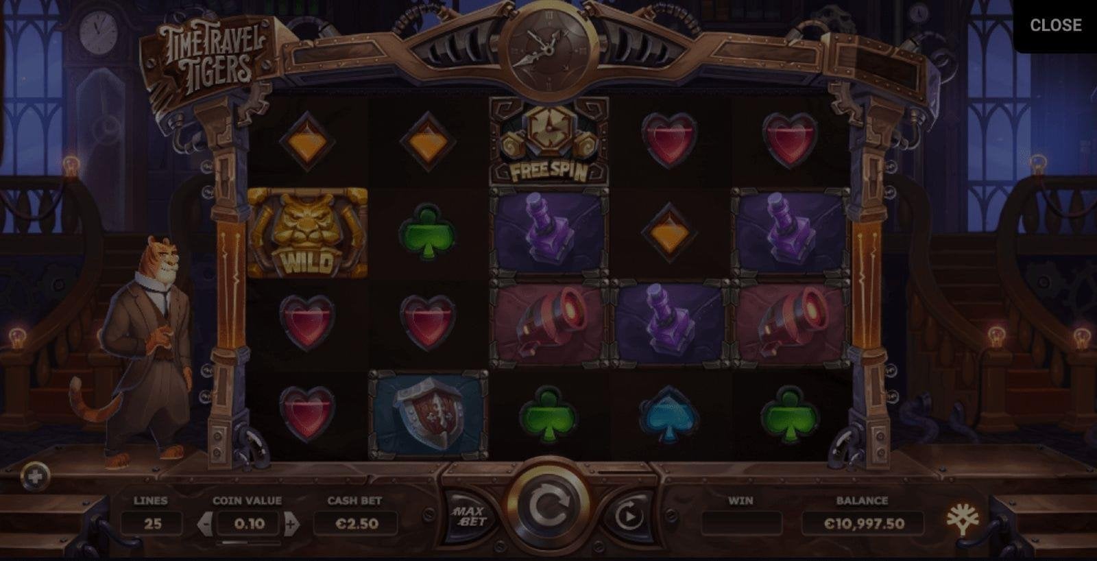 Yggdrasil released the Time Travel Tiger video slot in February 2020 and its excellent graphics and animations were instantly recognised by the online gaming community as some of the best to be released by this slot developer. There is an amusing background that sets the reels in Dr Tigerstein mansion, plus Dr Tigerstein stands on the side of the reels himself. He is an animated character constantly beckoning you on to spin the reels, looking at his watch, as well as other movements.