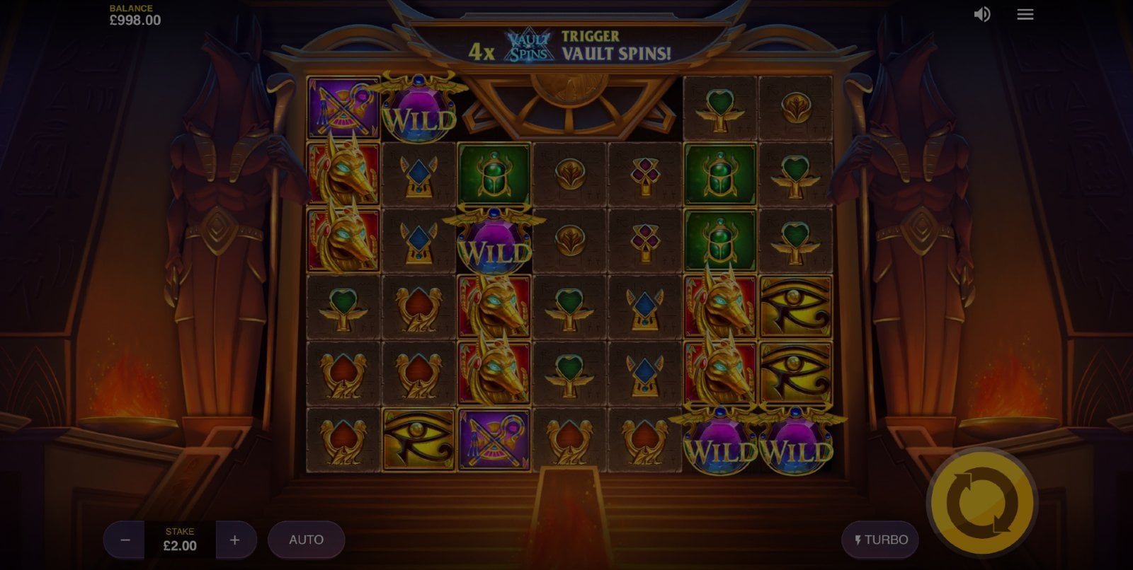 The Vault of Anubis slot title is a cluster pay slot game with 7x6 reels and a max win of 5,000x your spin bet. Land free spins with unlimited progressive multipliers, have your wins bumped up by random wilds, etch out more wins with supersize symbols, and multiple wins in a single spin from cascading reels.